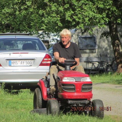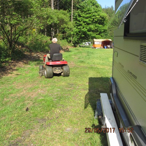 We found a spot with very few people near us and quickly set up, within 20 mins we were settled and had opened a cool beer each. We were just relaxing when the site owner decided to mow the grass, when he reached us he mowed around our outside ground sheet and around Homer, we were covered in grass! Very bizarre.