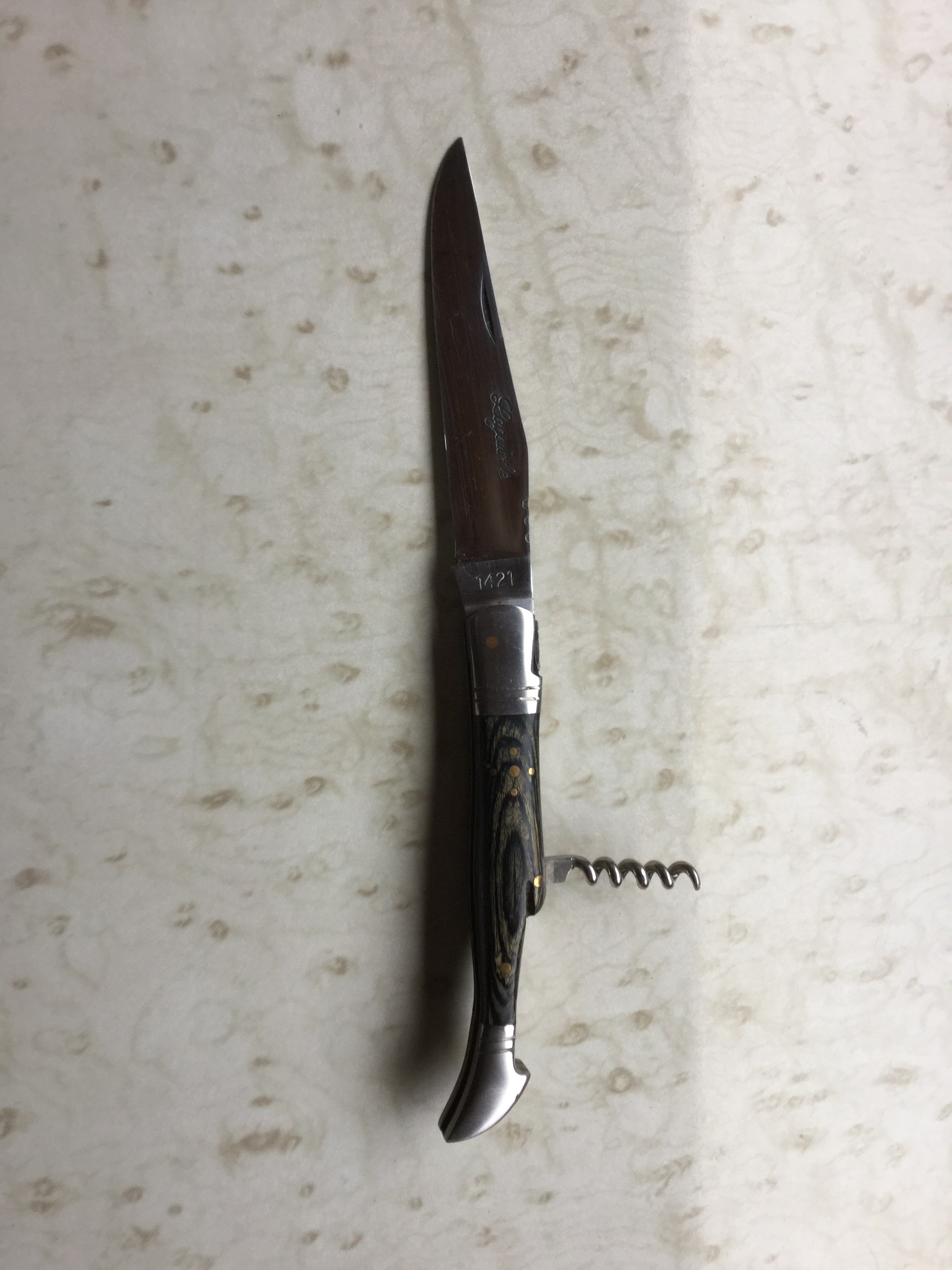 When we looked at the map for somewhere to move onto I saw the name Laguiole in the Monts D’Aubrac in the Lot region, this town is famous for its very expensive stylish knives and other cutlery, when I retired in 2010 and whilst we were in the Pyrenees I treated myself to one as a retirement present, it included of course a built in corkscrew. So with that in mind a visit to its birth place seemed appropriate.