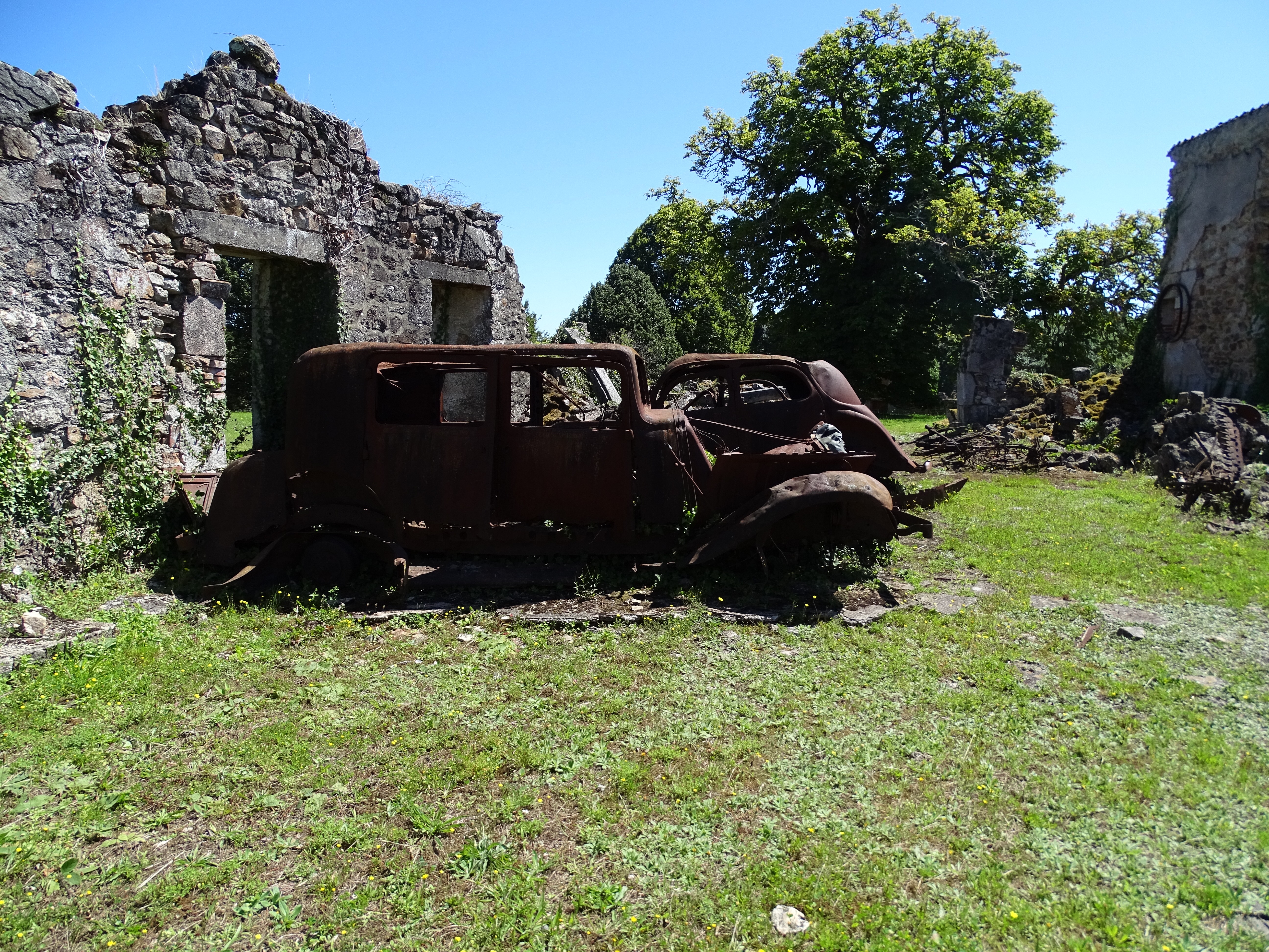 After the war President Charles de Gaulle ordered that the village remain as it was as a permanent memorial and museum honouring those who died. You enter the village through the modern museum and walk out into the streets preserved as they were, some houses are marked up with the names of the original inhabitants or their uses, shop, garage, cafe etc. Even the church wasn’t spared as all the women and children were herded into it and murdered before being set on fire. There are still a few relics from that time slowly rusting away, cars, beds, sewing machines etc.