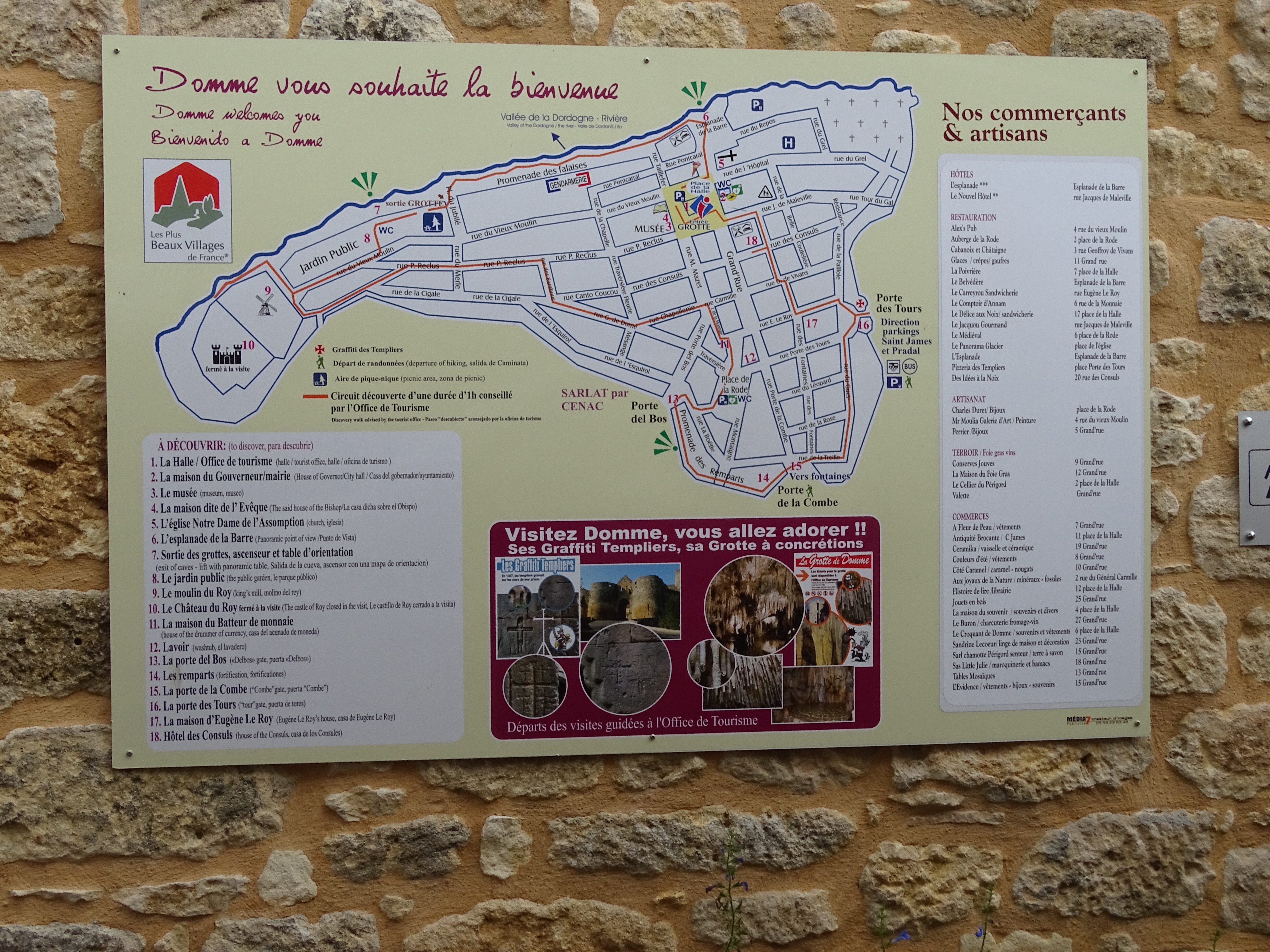 …Domme is classified as one of the most beautiful villages of France, it is perched high up with views down onto the River Dordogne, it is a fortified town and the walls and narrow entrance gateways still remain. Underneath the centre of the village are caves – Grottes – which can be explored.