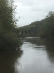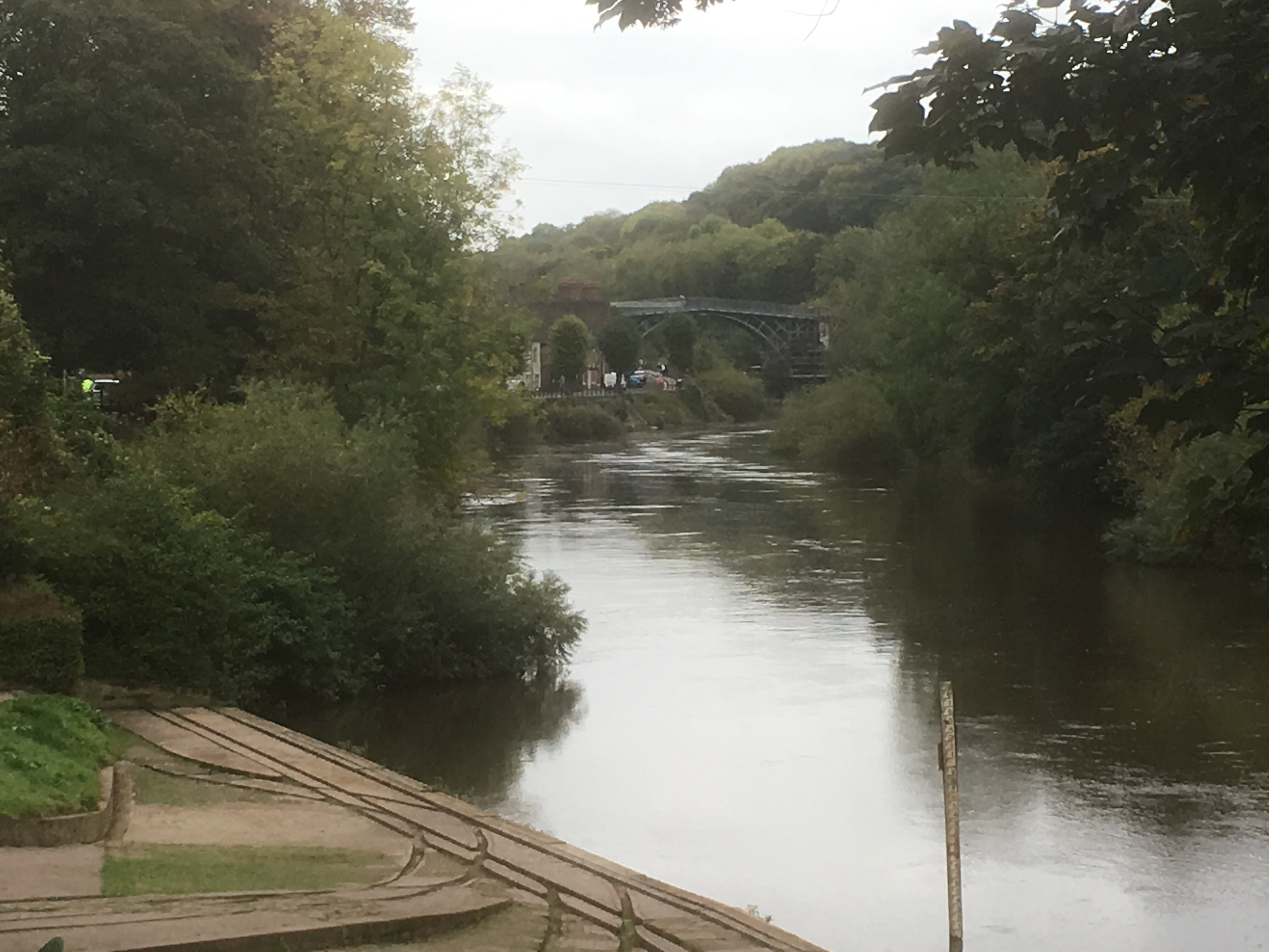 An autumn morning in Ironbridge, the day has a touch of coolness but warmed by splashes of colour from the autumn leaves, the River Severn is flowing quickly and is running high after the recent rains.