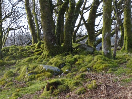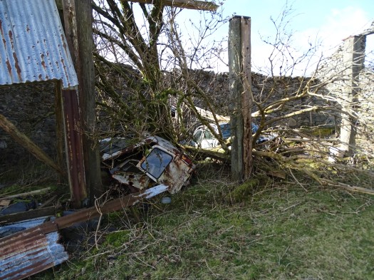 Initially we walked along a narrow country lane bounded by dry stone walls with sheep munching away in the fields on the other side, every where the walls, rocks ground etc is covered in deep green moss. The walk took us through a farm yard with old tractors and machinery and then past an old ruined cottage, along side it in the remains of what was probably a barn two old cars were rusting away. We entered an ancient wood, again deep in moss and Layla enjoyed some free time here bounding around over rocks and around trees, the journey back was the reverse of the way there with the added experience of Layla meeting chickens for the first time.