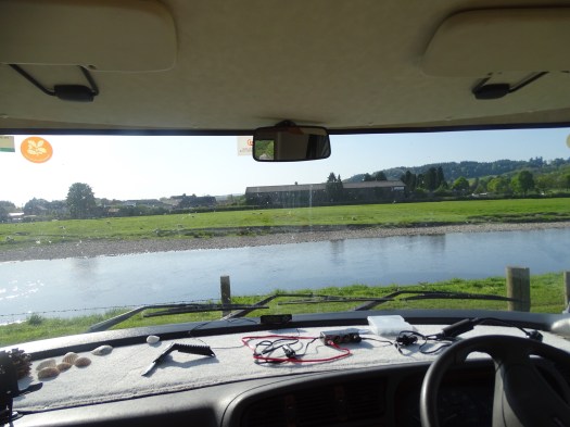The camp site borders the River Wye and we are camped up about 10m from the river with its glittering surface framed in our windscreen. We took Layla for a walk along the river and she enjoyed a long play in the water which was good to see as she seems to be a bit off colour today. We haven’t walked the few hundred metres into Builth Wells itself as we are saving that delight for tomorrow.
