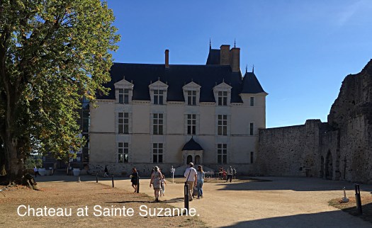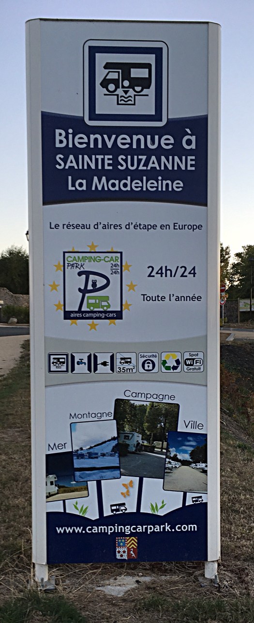Our stop for tonight is in a small village called Sainte Suzanne which is known a Cite Medieval and has other honours allocated to it for its natural beauty. During the afternoon the village was packed with guests for what appeared to be a ” society ” wedding, the guests were dressed very expensively and there was a large number of men in dress uniform from more than one of the services, the medals on chests made more noise than the church bells.