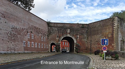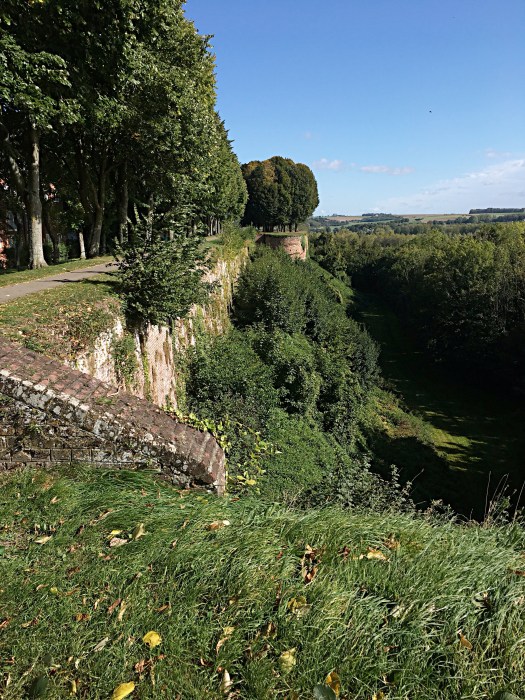 We have on two occasions today walked up the steep hill into Montreuile which is a walled citadel/ fortress the walls are built of brick and range from 10 to 30m high inside those, there are other fortifications and moat like structures. It’s possible, and we did, to walk around the 3km ramparts of the walls, there is no wall or fence between the path and the sheer drop of the walls, in today’s wind it was quite nervy at times and Layla constantly walked up to the edge and looked over giving Michelle heart attacks.
