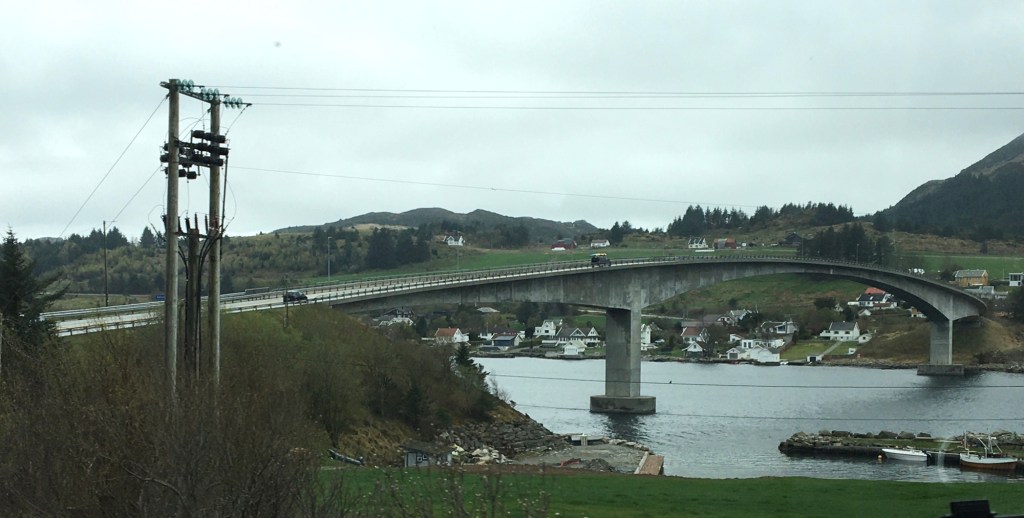 When we left the campsite this morning we immediately began a steep climb out of the valley up a road with numerous hair pin bends, 2nd gear necessary, we soon ran into cloud then rain, sleet and finally snowfall. Thankfully we eventually levelled out and drove into a very long tunnel, emerging at the other side what a change there was, only drizzle and very little snow lying on the ground. We began to descend which went on for a long time, the road we were on was leading us to a ferry, however en route we went through 19 tunnels.