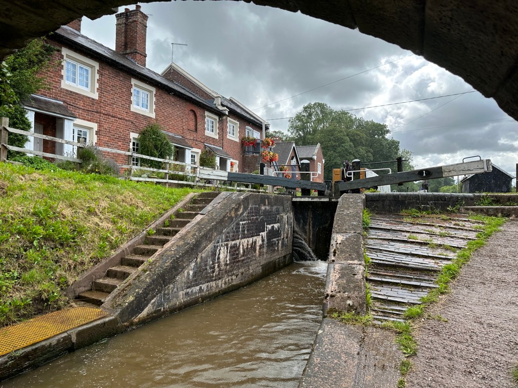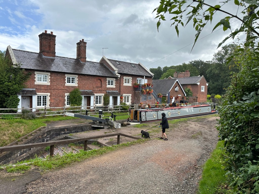 Another day with sudden short heavy showers of rain. We spent the morning walking along the lane to the Shropshire Union Canal at Tyrley Wharf locks. Here we spent a pleasant hour dodging the showers. and helping the narrow boats through the locks, a learning experience for Michelle.