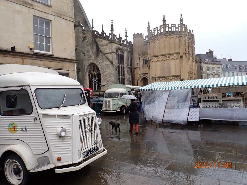 It was a weekend of participating in the game of “dodging the heavy showers” sometimes we were lucky other times not getting quite wet, thankfully we had extra coats and other clothes. We managed to get back to Homer in Broadway just as the heavens opened so we sat out the weather and had a leisurely lunch. From there we drove on pausing for a while in Stow on Wold before getting to the site late afternoon. It rained heavily from 5 a.m. onwards and on Saturday morning we set off on our walk into Cirencester in heavy drizzle.