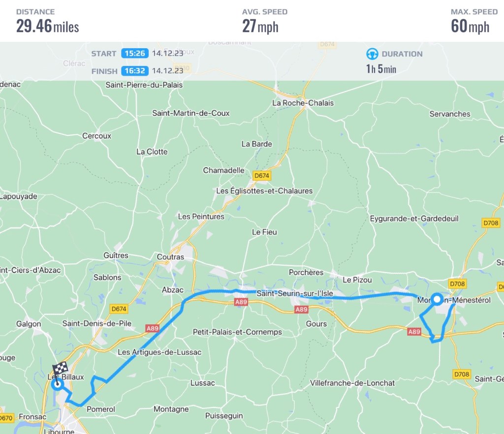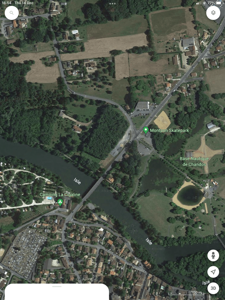 Our last journey of the day was down the valley to Libourne but we did deviate back to our ex neighbours house to deliver her Christmas card. As we approached Libourne Michelle guiding, she told me to take a right turn, after 2 km the road was closed due to flooding, as was the next one we tried, the third led us along a narrow dry road just the width of Homer and it then dipped down and there was a short tunnel under the railway that only gave us 10cm headroom it was a wincing experience.
