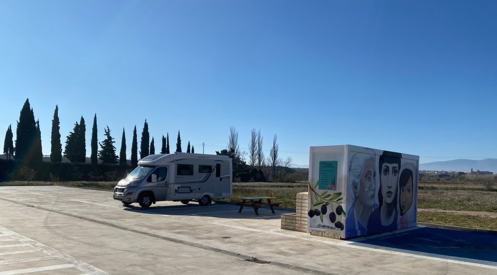 When we left the previous nights stopover at Pamplona the outside temperature was minus two and we soon drove into fog that as the journey progressed got thicker and thicker making for an unpleasant journey, thankfully a few miles short of our destination we emerged into bright sunshine. The aire is 5 euros a night paid into a honesty box and has all the facilities we need.