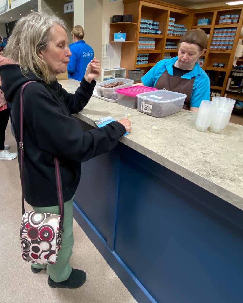 These are on display on the counter which is the tasting area. An assistant gives you a small plastic pot and then proceeds to give you one after another small piece of the different chocolates. I think we tried at least 10 as she kept pulling boxes out from underneath the counter.