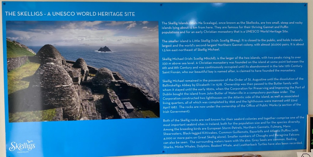Skelligs chocolate factory is located on the edge of St Finian’s Bay overlooking the Skellig Rocks upon which are ancient monastic ruins, in the 6th century a small group of monks retreated there seeking solitude , 618 steps climb an ancient stairway to the settlement of beehive huts, churches, cemetery and garden.
