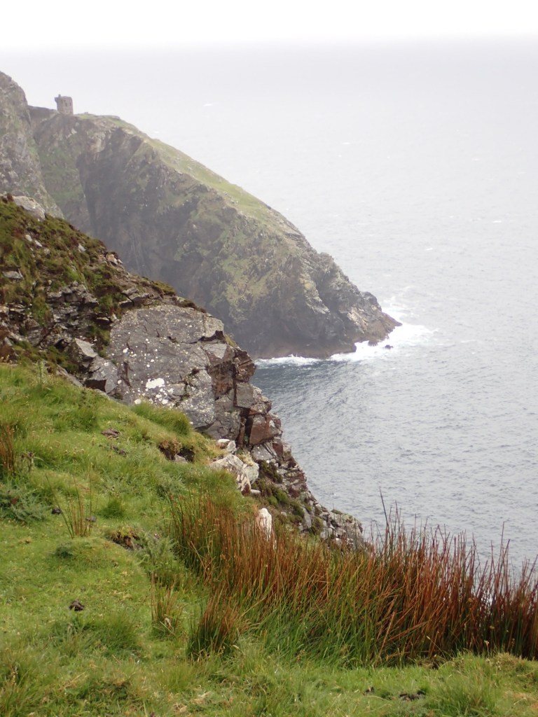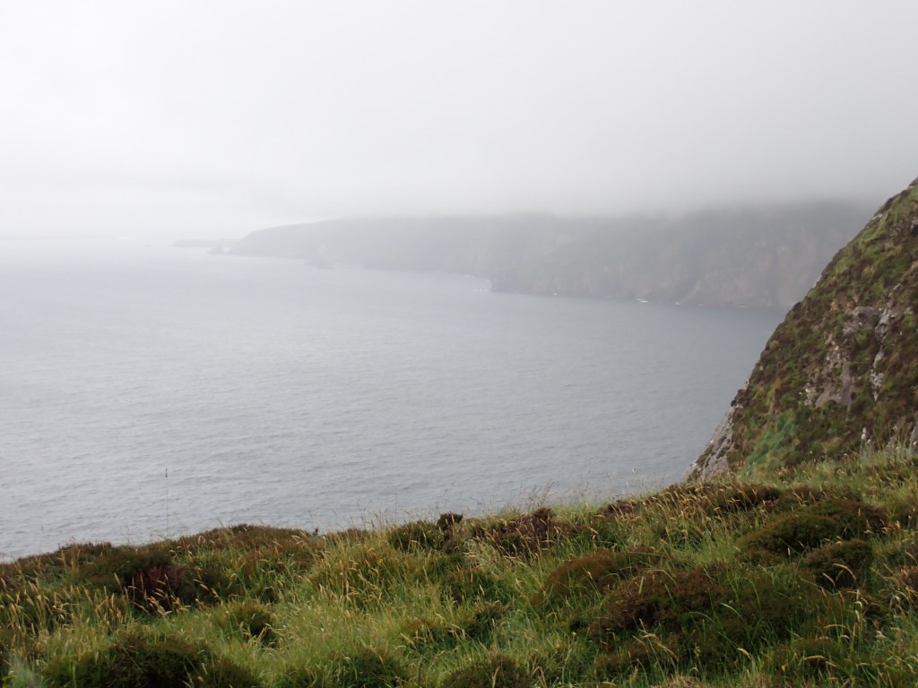 Our first stop was Sliab Liag Visitors Centre which was a modern building housing displays of the geology and history of the region, plus it had a good cafe and toilets. From the centre you can pay to catch a shuttle bus to take you up to the top of Slieve League Cliffs. These cliffs rise almost 2,000 ft from the Atlantic Ocean, Slieve League is one of the highest cliffs in Europe. They are almost three times higher than the Cliffs of Moher we visited last week. However similar to last week when we emerged from the shuttle bus the rain was lashing down and the clouds were very low.