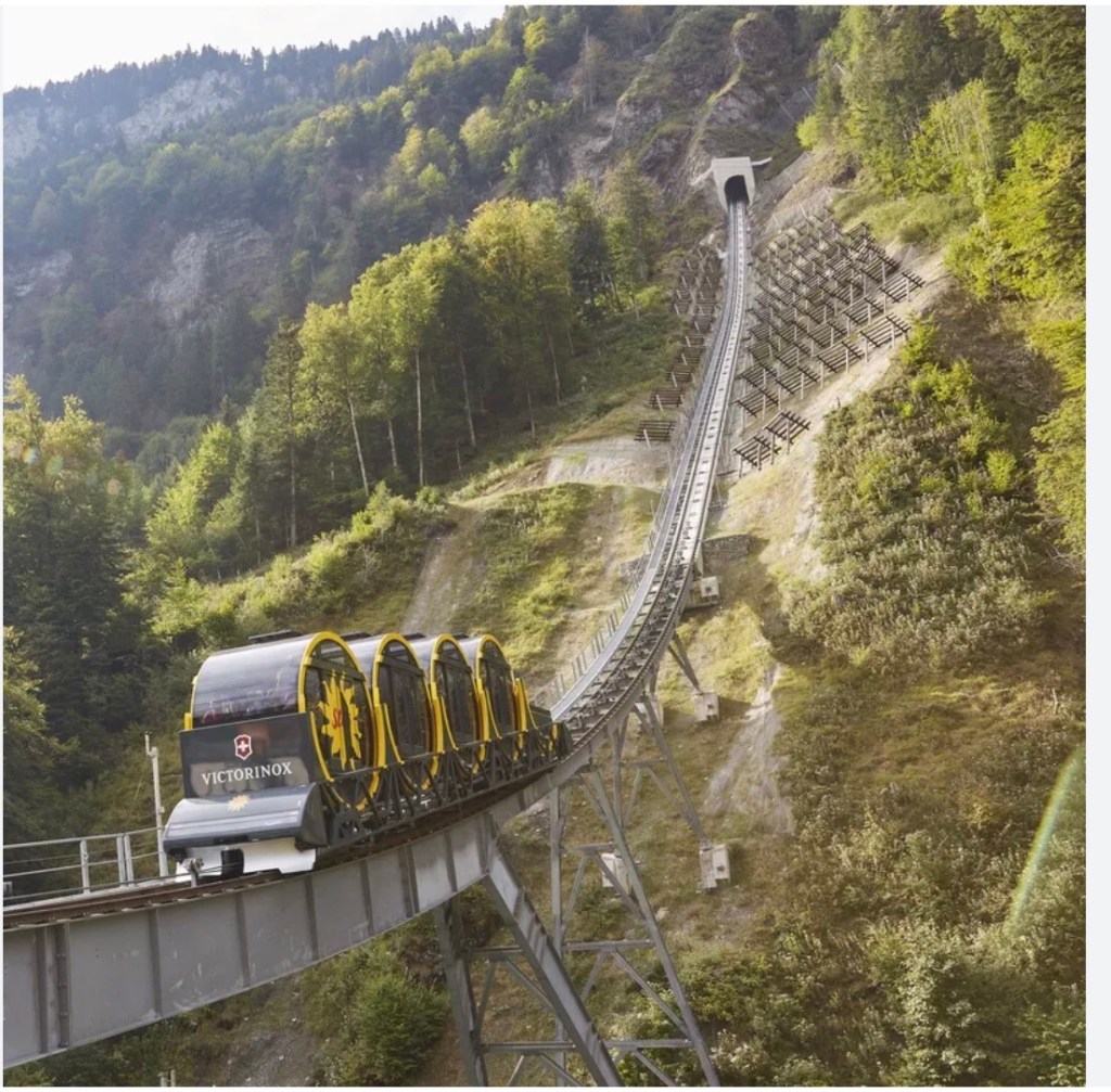 The funicular railway from Schwyz is the steepest in the world and provides access to the car free mountain village of Stoos. You are carried up in what resembles large washing machine drums that self level as you travel up.