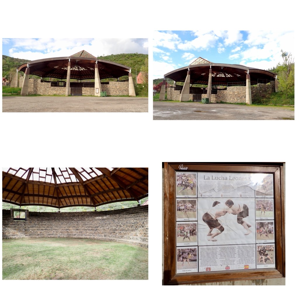 On our evening walk we came across this covered arena. It has been built to house La Luche Leonese, Leonese wrestling, specific to this region and takes place in a “corro” a circle 12-18m in diameter with traditionally a grass surface. Contestants wrestle bare footed in short trousers and shirt with a leather belt that can be gripped by the opponent.
