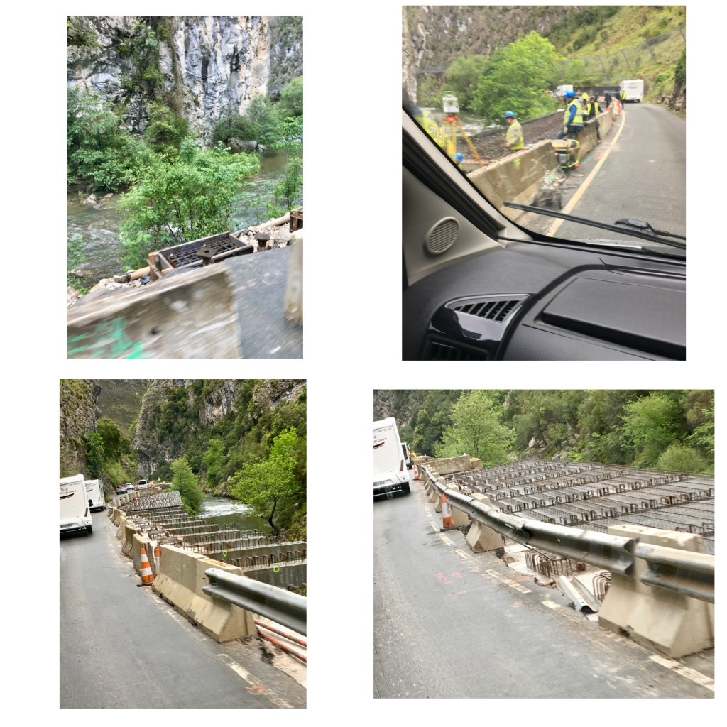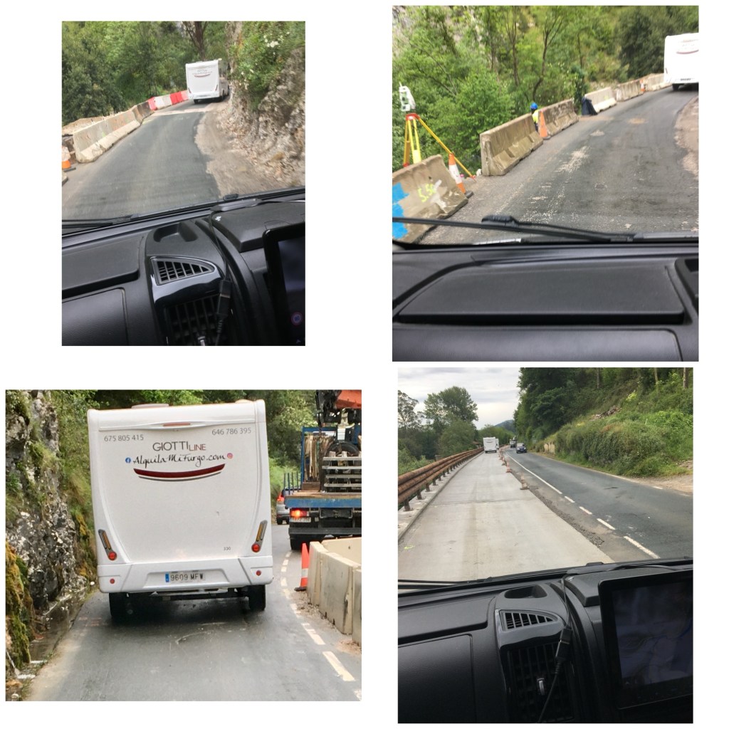 We took the N621 out of Potes heading for the coast, and intended to stay on it for approx 30km estimated time of travel 36 minutes, however what we didn’t know was that this road has been under reconstruction for about 6 years as it has slowly been slipping into the fast running river that’s runs alongside. In some areas slightly more than 50% of the road has disappeared into the river. Workmen are working on different sections possibly tackling the worst places first, this means for quite a distance the road is down to only one very narrow lane and contra flow was in place, we had to stop and wait about 5 times for up to 15 minutes for the road to clear. Then the fun began.