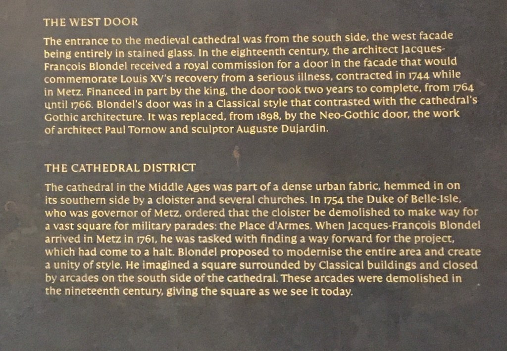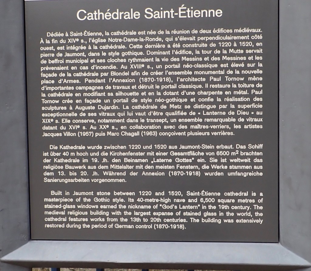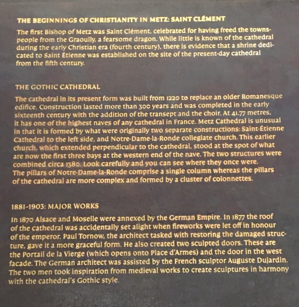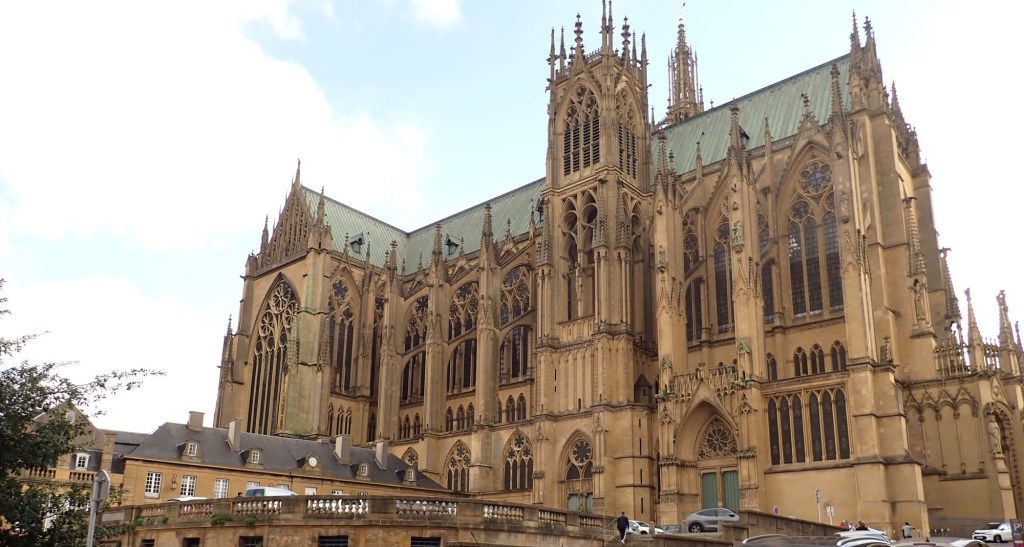 After viewing the Cathedral we wandered off into the rest of Metz, there were some high end shops selling expensive clothing and items such as fountain pens at over €2,000. We decided not to blow the holiday budget but I did buy a jar of jam for €3.40. However when we stopped for a beer each it did cost €10.20, got to get used to it before we hit Switzerland.