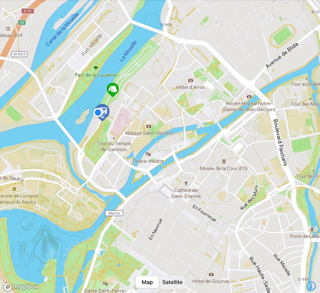 We are staying tonight on a municipal site for motorhomes only, it is situated on an island with River Moselle flowing down both sides.